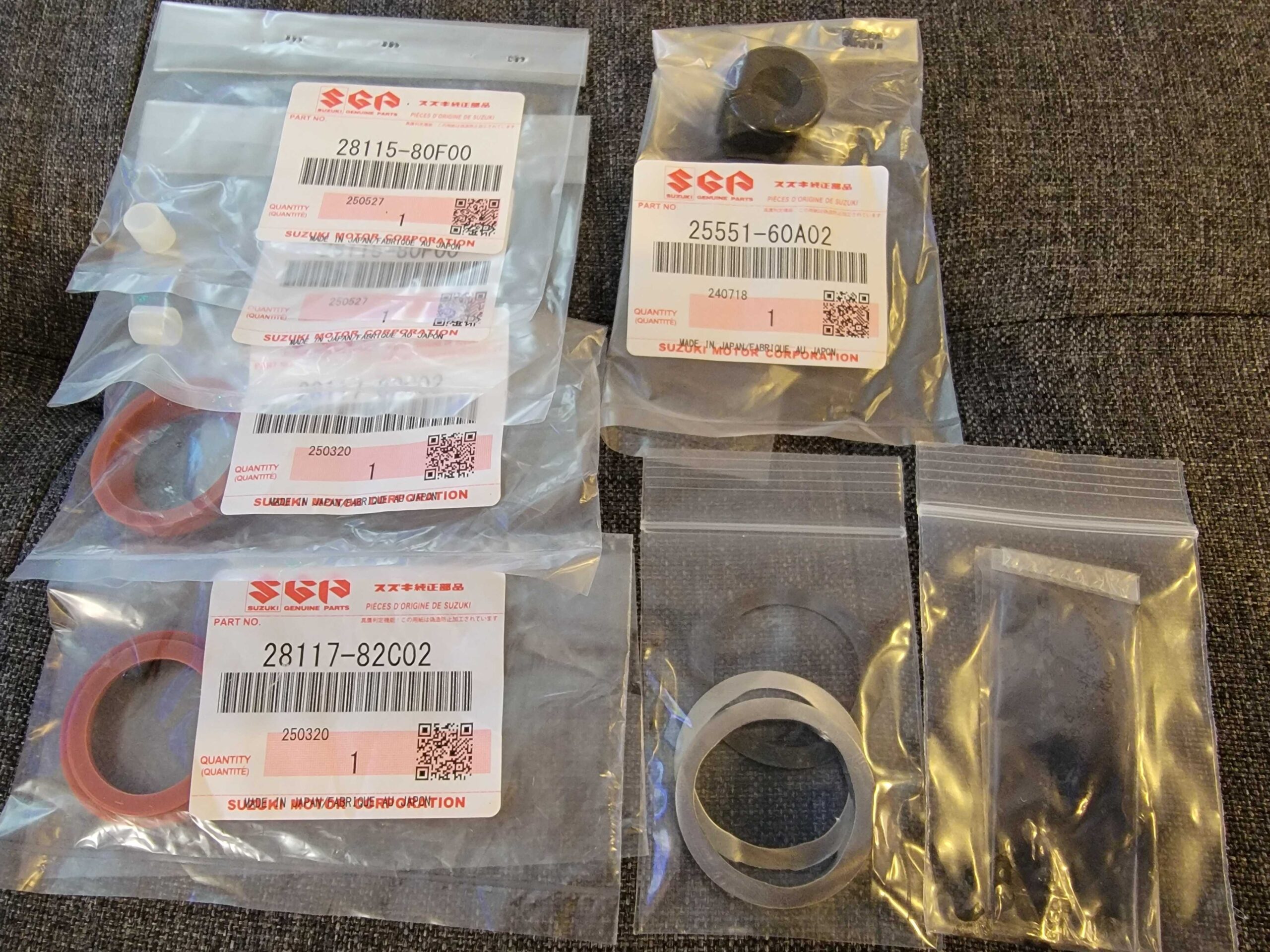 This kit features OEM part numbers: 2x 28115-80F00, 2x 28117-82C02, 1x 25551-60A02, 1x packet of grease, 1x pack of metal washers